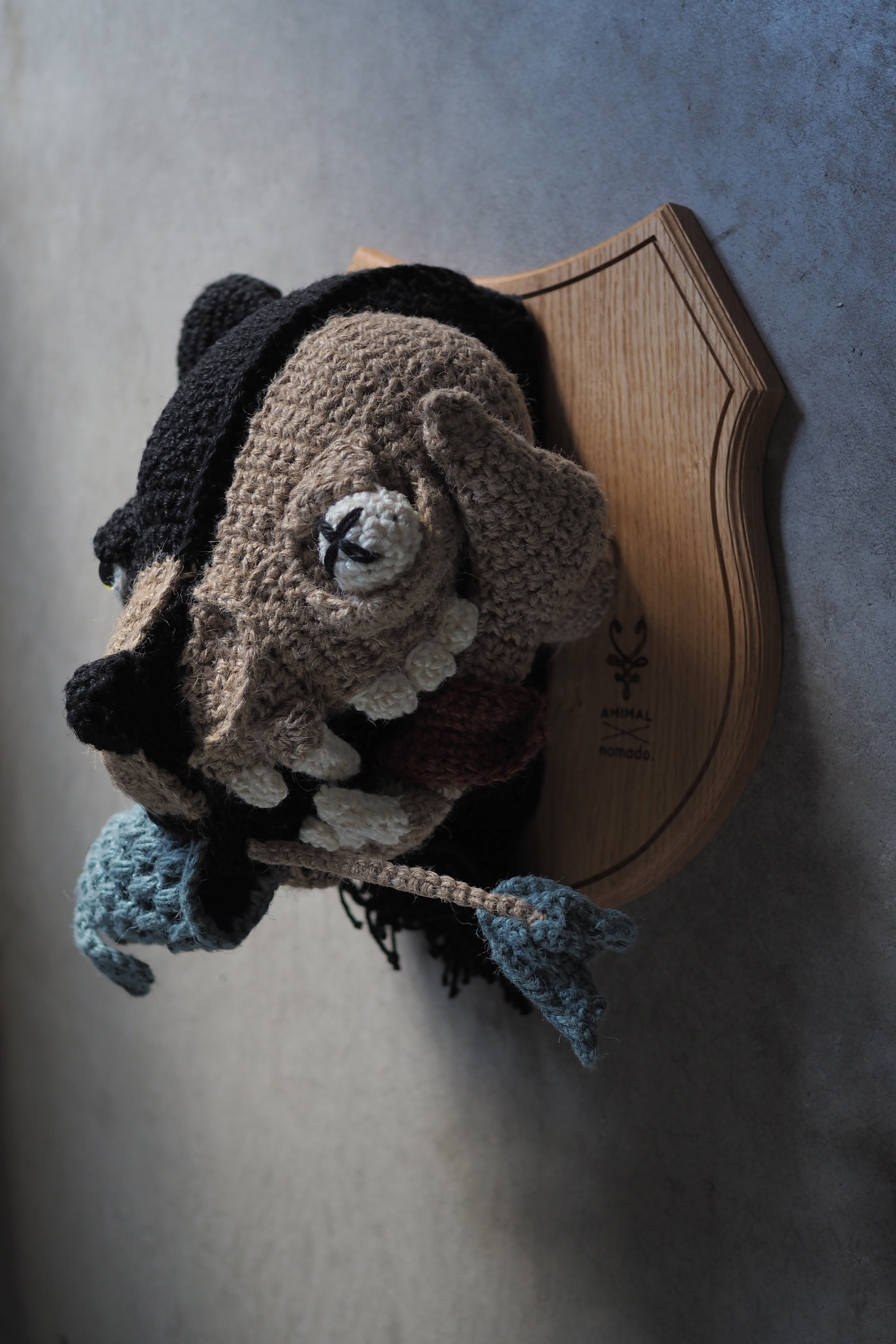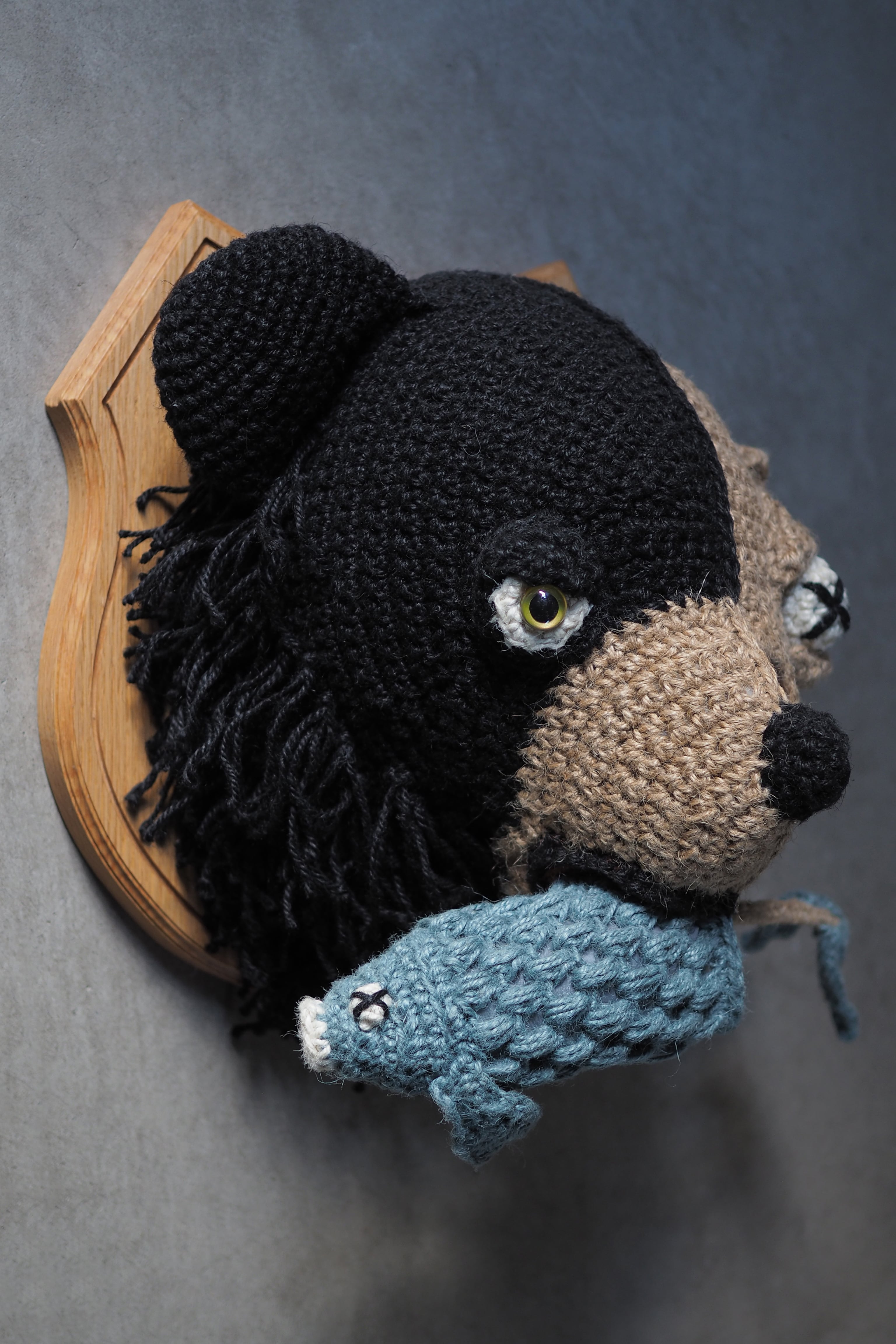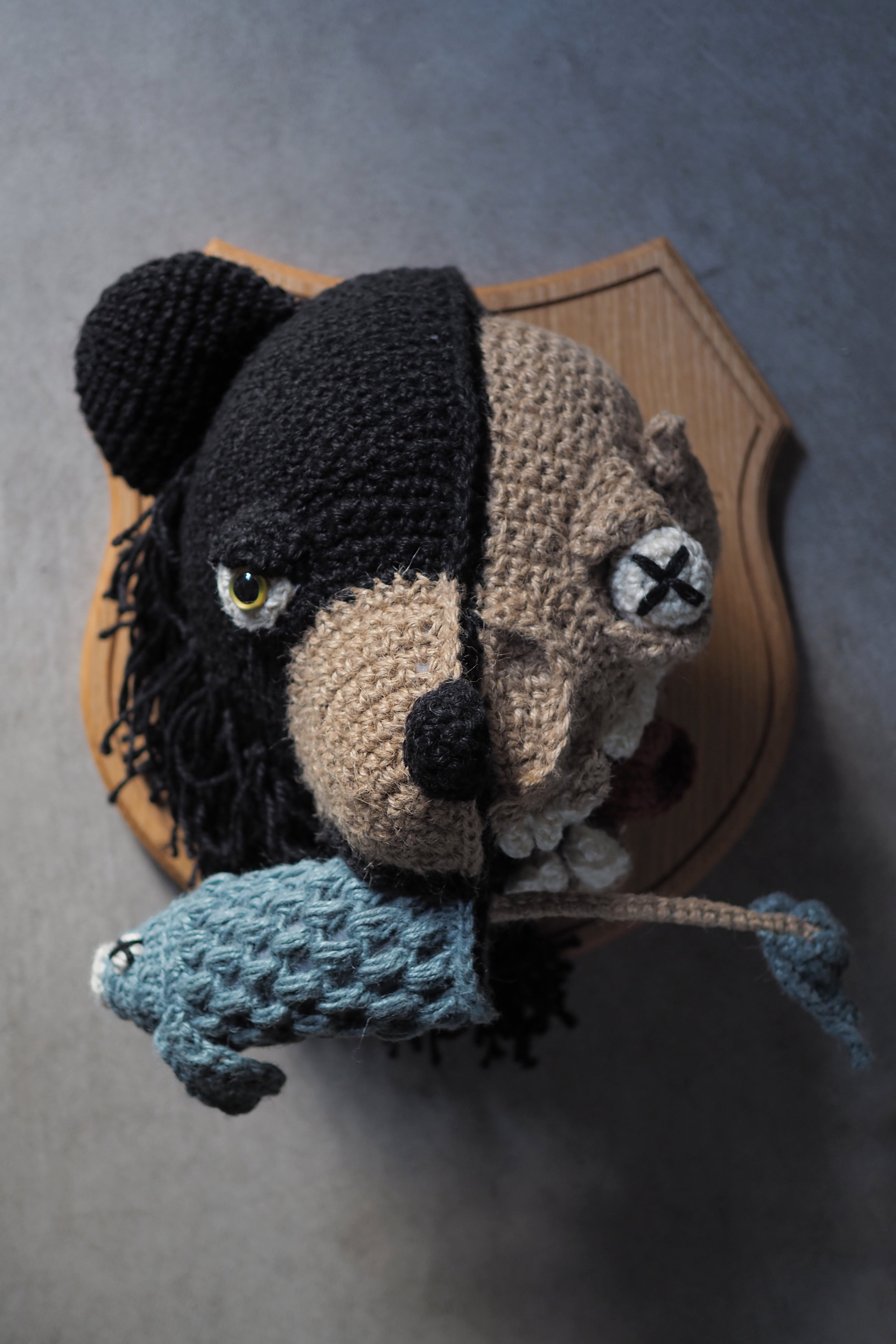 左がクマの生体、右が頭蓋骨になっている(おサカナも)アニマルトロフィーです。少し怖い、よくみるとかわいいかもしれない(?) 壁掛けインテリアです。サカナの骨部分には針金が入っているので、好きな形に整えることが可能です。